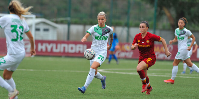 Il Sassuolo Femminile ci prova subito all’8 con Sofia Cantore che lascia partire un destro che sorvola la traversa . Il match si sblocca al 22′ con la sopracitata Valeria Pirone che di testa insacca alle spalle di Diede Lemey. Giallorosse pericolose sempre con Valeria Pirone con un sinistro al volo che esce di poco. Sassuolo Femminile che affida le sue sorti sempre a Sofia Cantore che ci prova in mezza girata, ma il pallone esce di poco .Si va negli spogliatoi sull’1-0 per le locali.