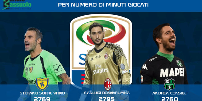 Tra i primi tre si classifica Andrea Consigli, portiere del Sassuolo, con 2760 minuti giocati. Al secondo posto tocca al portiere del Chievo, Stefano Sorrentino, con 2769 primi all’attivo. In cima al podio c’è invece Gianluigi Donnarumma del Milan, con 2795 minuti all’attivo.