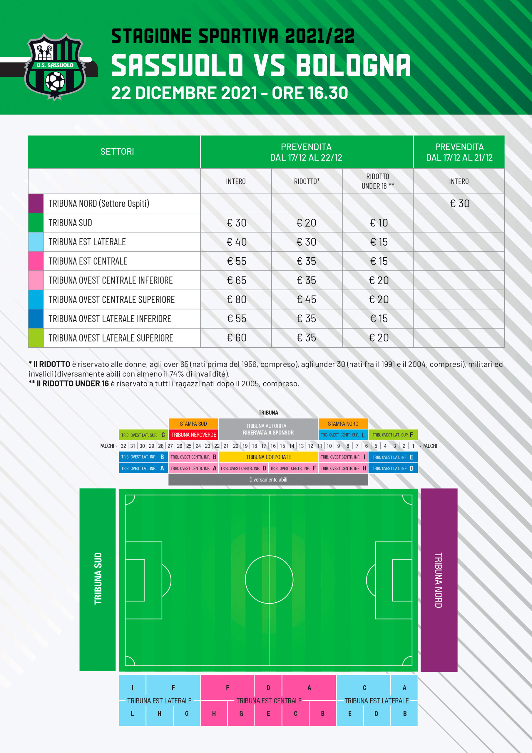 Il Sassuolo Calcio, ricorda che l’acquisto dei tagliandi nel settore di Tribuna Sud (Curva Sassuolo) è vietato ai residenti nella provincia di Bologna. Nella stessa Tribuna Sud, per questioni di sicurezza ed ordine pubblico, è VIETATO l’ingresso di maglie, sciarpe, bandiere della squadra ospite; si ricorda infatti che il settore in questione è esclusivamente riservato ai tifosi del Sassuolo.